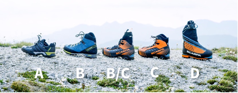 Adäquat zum vorgesehenen Einsatzbereich werden Bergschuhe in verschiedene Kategorien untergliedert. Es gibt von Hersteller zu Hersteller Unterschiede, es hat sich jedoch die folgende von Meindl entwickelte Kategorisierung etabliert. Die Skala reicht von Kategorie A - Multifunktionsschuhe, bis zur Kategorie D - hochalpine Bergschuhe. Schuhe die zwischen den Kategorien liegen werden z. B. mit B/C angegeben. Der Übergang ist fließend und nicht exakt abgrenzbar. Generell gilt, je anspruchsvoller eine Unternehmung, desto höher ist die Kategorie der Schuhe zu wählen.