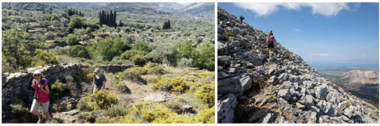 Weiter führt unser Weg über den höchsten Gipfel „Profitis Ilias“ 567m auf Pfaden mit wunderschönen Ausblicken und durch Weinberge zum höchstgelegenen und ältesten Dorf Pyrgos mit seiner