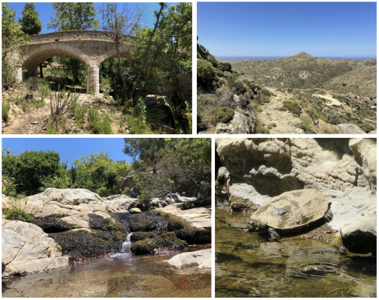 des Bachbettes, des Xerotakari, des größten Wasser führenden Baches auf Naxos, das immer wieder überquert wird. Die Wegstrecke führt zunächst über einen Schotterweg, dann über einen Eselspfad