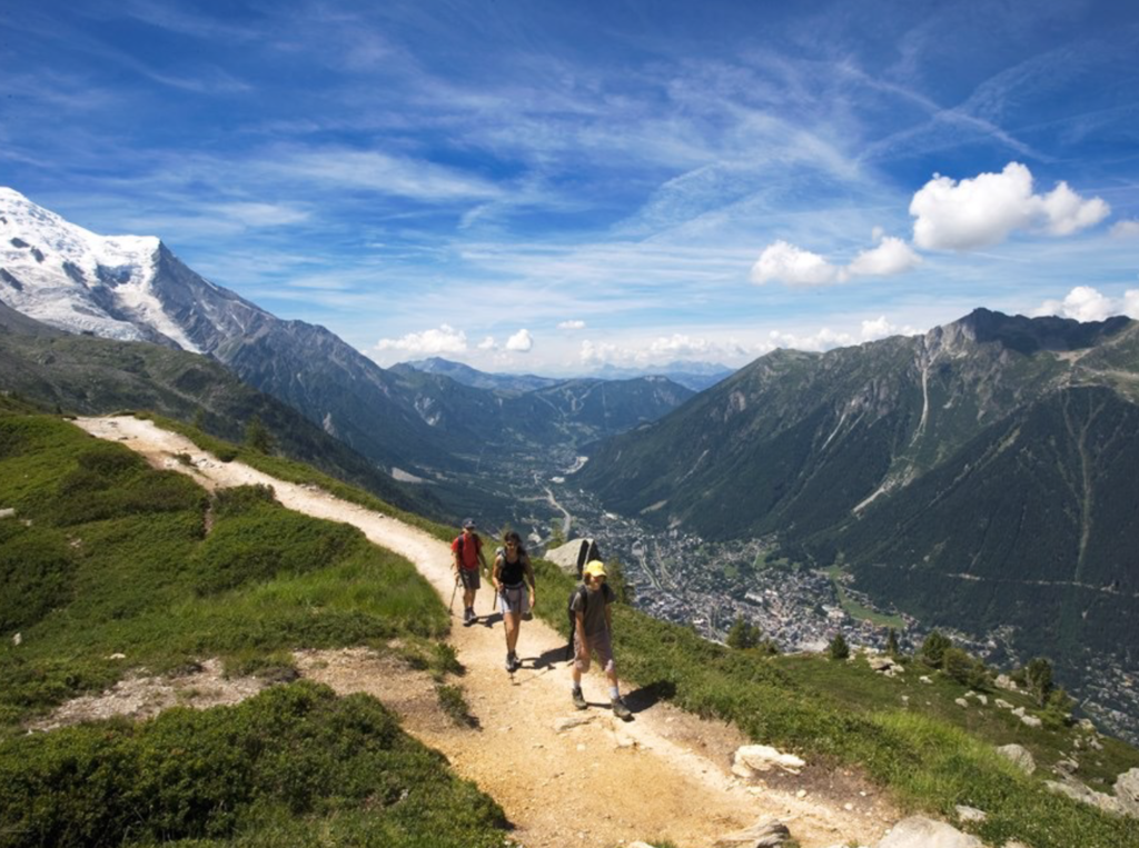 Von Trient aus geht es bergauf bis zur französischen Grenze am Col de Balme (2.191 m). Vom Pass aus erstreckt sich das gesamte Mont-Blanc-Massiv; das Chamonix-Tal, der