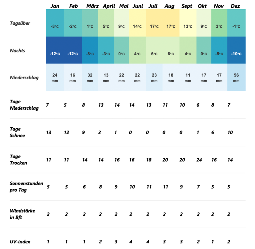 Chamonix-Mont-Blanc hat das Tundrenklima. Es ist hier das ganze Jahr über kalt. Die durchschnittliche Jahrestemperatur Chamonix-Mont-Blanc beträgt 15° Grad und der Jahresniederschlag beträgt 332