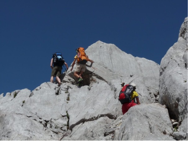 Solche Kletterer haben beim Abstieg über Geröllfelder oft mehr Probleme als beim vertikalen Aufstieg an winzigen Tritten. Einen indirekten Zusammenhang kann man aber durchaus herstellen: je trittsicherer man ist, desto besser auch die Gehtechnik, die Koordination und das Gleichgewichtsgefühl. Diese körperlichen Fertigkeiten beeinflussen wiederum die Reaktionen von Gehirn und Unterbewusstsein bei geringem optischem Augen-Input in ausgesetztem Gelände.